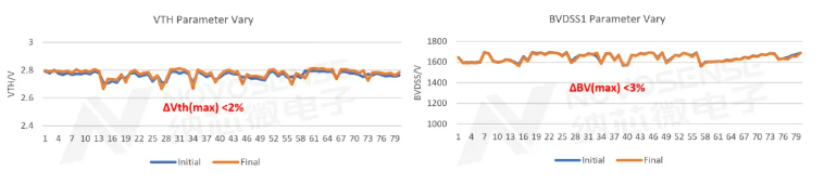 此外,功率产品开发中可靠性验证与质量控制是纳芯微非常重视环节之一。为了提供给客户更可靠的碳化硅MOSFET产品,在碳化硅芯片生产过程中施行严格的质量控制,所有碳化硅产品做到 100% 静态电参数测试,100%抗雪崩能力测试。此外,会执行比AEC-Q101更加严格的测试条件来执行产品可靠性验证,如下图: