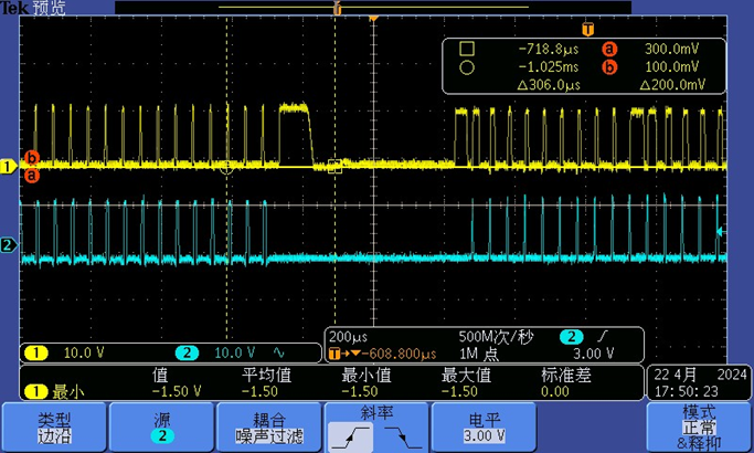 Stepper Motor 1: 2kHz step frequency, 20kHz modulation frequency, The back electromotive force for OUTA1 and OUTA2 during normal rotation is 3.2V, as shown in Figure 11. The back electromotive force for OUTA1 and OUTA2 during a stall is 0.2V, as shown in Figure 12.