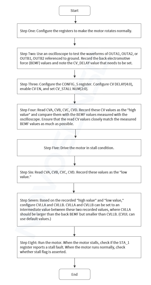 The CONFIG_5 register is set to 0x078001 (CV_DELAY = 0) to sample at the end of zero current point. CVLLA is configured to 0x0E00DB (2.98V). When the motor stalls, FUNCTION_ERR can be detected, and by reading back STA_1, the STALL bit is set to 1.
