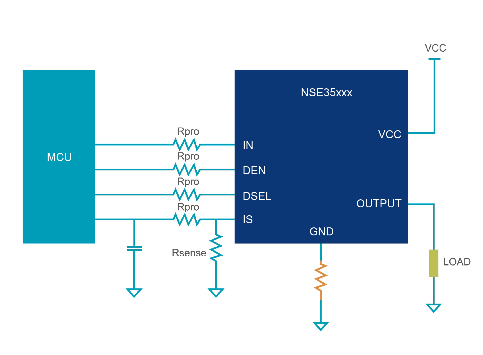 NSE34xxx/NSE35xxx系列高边开关适用于驱动车身BCM等系统中各类传统的阻性、感性和卤素灯负载,同时也充分适配区域控制器ZCU中一/二级配电下常见的大容性负载。该系列产品提供1/2/4通道选择,并兼容HSSOP-16/HSSOP-14封装,导通电阻范围横跨8mΩ到140mΩ。芯片内置精准的电流检测功能,适用于负载端的故障诊断与保护及负载电流的实时检测。此外,NSE34xxx/NSE35xxx系列还集成了全面的保护机制,包括过流/短路保护、过温保护、过压保护、失地/失电源保护、反极性保护和开路检测功能。