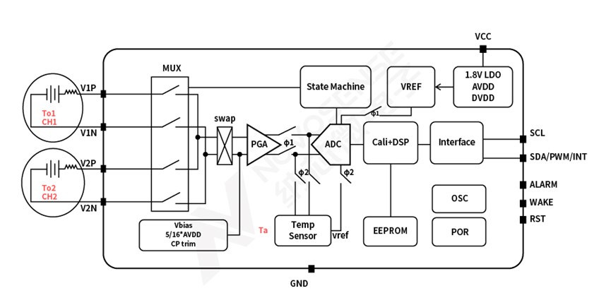 图:纳芯微针对热电堆传感器的信号调理芯片NSA3300功能框图