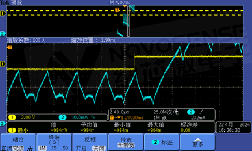 步进电机1:2kHz step频率,20kHz调制频率,正常转动时之间的OUTA1,OUTA2的反电势为3.2V,如图11。堵转时OUTA1、OUTA2之间的反电势为0.2V,如图12。